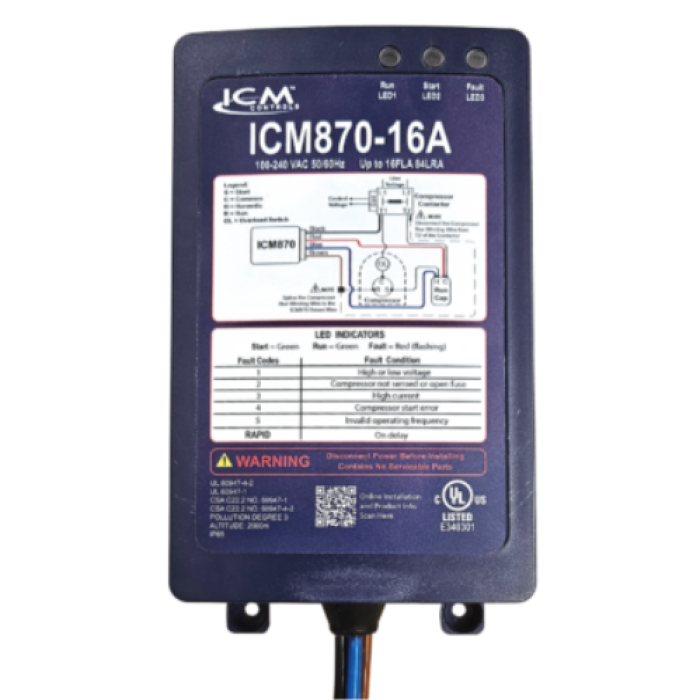ICM™ Motor Soft Starter, Series: ICM870 Series, 100-240 V, 16 A, 50/60 Hz, -40 to 149 deg F, 7.94 in L x 4.2 in W x 2.1 in H, Domestic/Import: Domestic, Additional Information: 36000 Btu, 3 ton Capacity, 0 to 95% Non-Condensing Humidity, 7.36 x 2.97 in Screw Hole Center Points, Compressor Output, 20 A Interrupt Rating, IP65 Enclosure Type