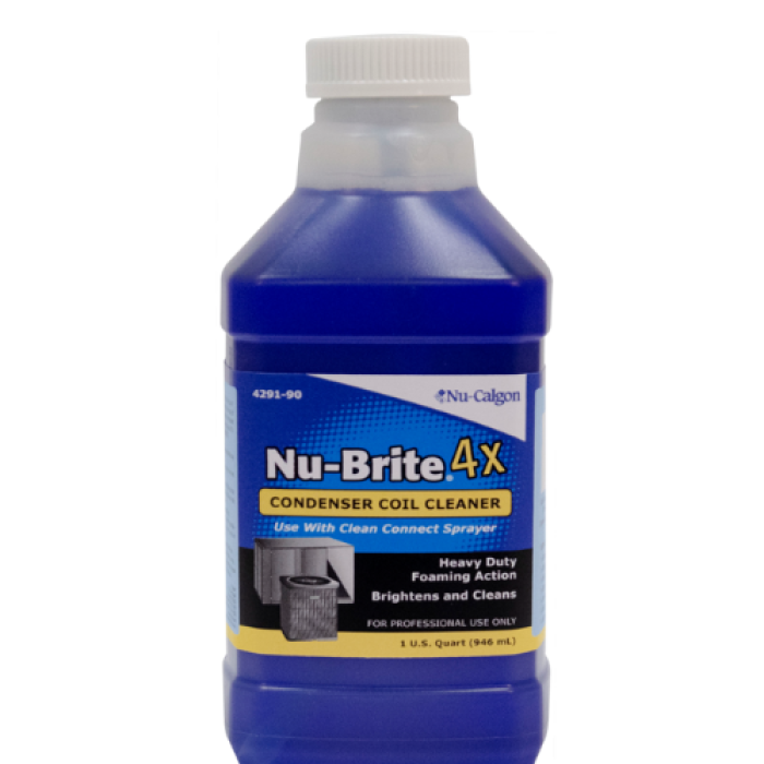 Nu-Brite® is a non-acid, alkaline-based product for cleaning and brightening air cooled condensers. It is formulated with the best available foaming detergents and chelants to quickly penetrate and dissolve greasy dirt and grime and foam it right out of the coil. The safer alternative to acids. For cleaning and brightening air cooled condensers and other finned heating and cooling coils located outside. It is an alkaline-based cleaner that does all that an acid will do without the danger of an acid. Nu-Brite® state of the art surfactants and cleaners instantly penetrate and lift layers of oily grime and corrosive deposits from the coil. Its foaming action pushes this loosened debris out of hard-to-reach areas restoring equipment to peak efficiency. It is not recommended for indoor use. Nu-Brite® 4x is a new concentrate version available in a ready-to-use quart bottle. One concentrate quart equals one gallon traditional Nu-Brite® (at 4:1 dilution use). Nu-Brite® 4x takes less space on truck, is easy to carry-on roofs and has cleaner connecting no more pouring or spilling. The specially developed packaging has a dilution insert assembly simply use what is needed, cap bottle and use for another job. The product ships as a limited quantity easier to get to the job site. Nu-Brite® 4x requires the clean connect sprayer.